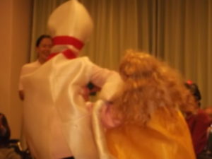 風船バレーの後は、職員によるケンケンリレー!職員も着ぐるみを着て頑張りました。