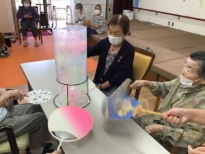 筒の中に入った風船をうちわで扇いで筒の上から飛び出させるゲームです。