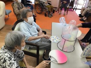 筒の上からポンッポンッと風船が飛び出すのを見て「おお~」という驚きの声や笑い声が飛び交いました。