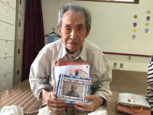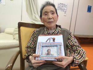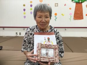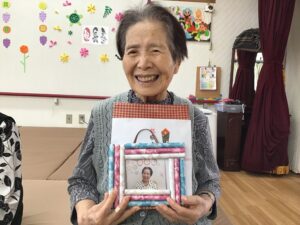 デイサービスの職員が心を込めて作った写真入りの壁掛け飾りと心ばかりの景品です。