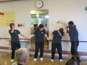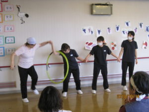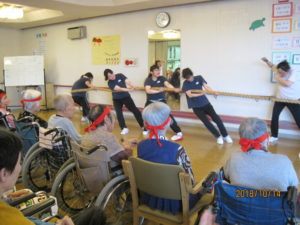 去る10月14日(日)鶴舞苑にて秋の運動会を開催しました。「障害物競争」「玉入れ」「お菓子取り競争」などの競技を行い、競技の中でも大盛り上がりの種目だったのは、職員対抗の「綱引き」と「フラフープくぐり」でした(これがなんと本当にガチンコでした!)。