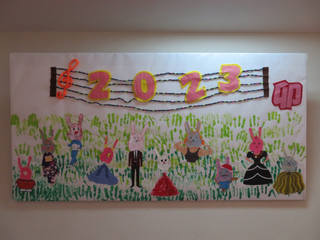 こちらは、来年の干支の壁画です。「卯」生まれの入居者、職員の手形を顔にして