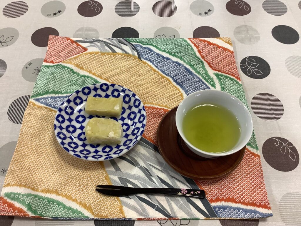 メニューは、さつま芋のきんつばとそのぎ茶です🍵