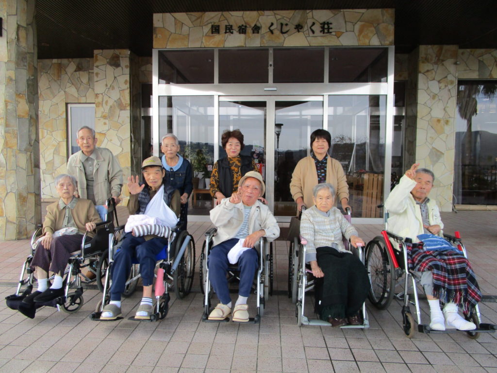 国民宿舎くじゃく荘の玄関前で、写真撮影📷 ご家族さんもいい表情で写りました