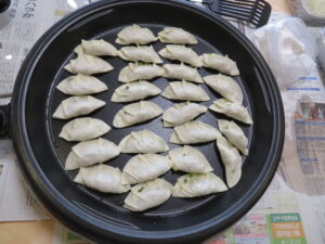 ホットプレートで、焼き上げました。焼きあがった餃子は熱々の内に本日の昼食として