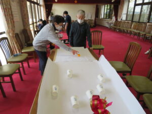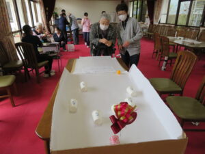 「紙コップボウリング」では、ボールを3投転がして、紙コップに入った点数を競います。
