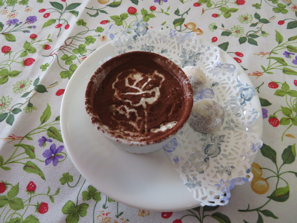 ココアパウダーが、薔薇の花になっています。すごく手が込んでますね🎵