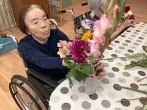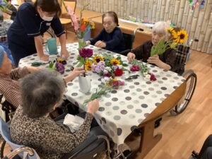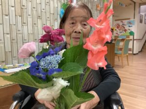 ひまわりやグラジオラス、ダリア等夏らしい花を活けてもらいました。