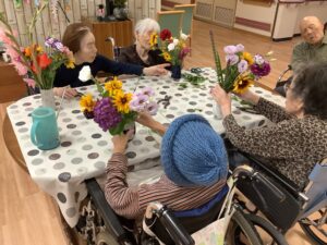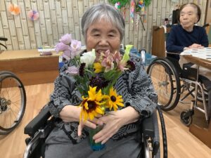 ひまわりやグラジオラス、ダリア等夏らしい花を活けてもらいました。