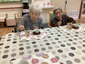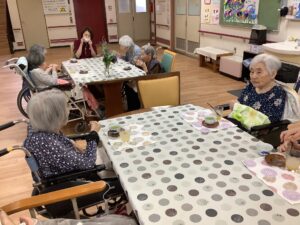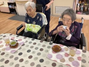 孔雀の絵が描かれた湯のみを見て、「くじゃく園には白い孔雀がいるとよ」という話から「生まれはどちらですか」とどんどん会話も弾み、笑顔が溢れる楽しいひと時となりました😊