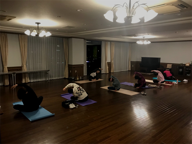 「リトセア ヨガ スタジオ」主宰の木戸先生(今年の9月に一般向けの1Day講座として実施したヨガ講座でもお世話になりました!)が月に2回、シンフォニー稲佐の森に来てくださり、日勤の職員たちの仕事が終わった18時からヨガレッスンを開いてくださっているのです。