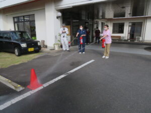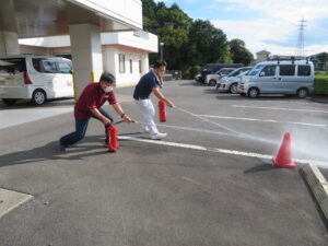 訓練終了後は、水消火器を用いて初期消火訓練も行いました🎵