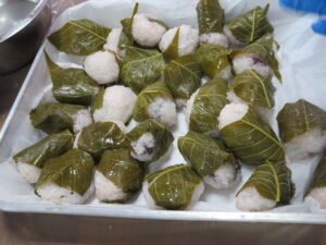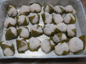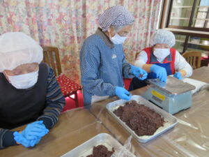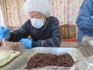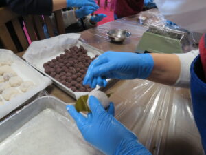 もち米と、道明寺粉を混ぜた生地に包み込んでいきます。