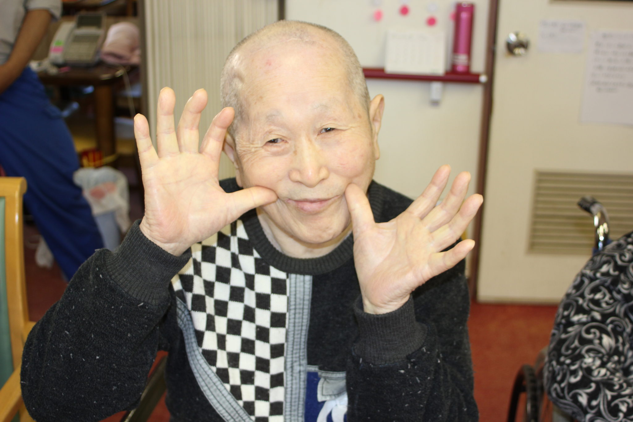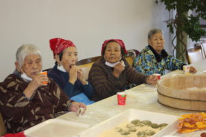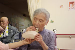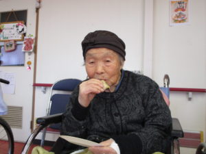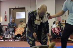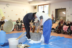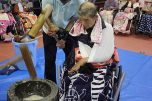 利用者の皆さんは、餅をつくたびに大きな声で ”よいしょっ よいしょっ”と掛け声を頂きリズムと温かい声援を頂きました