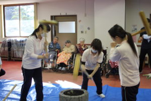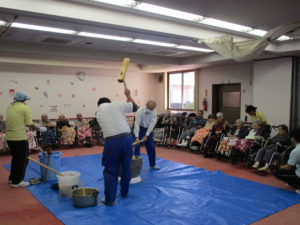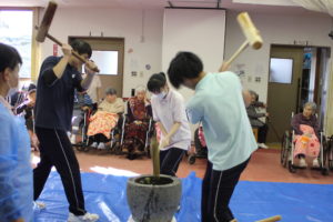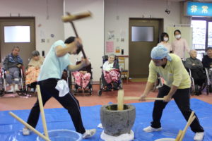 ご利用者の方々も杵を持ち餅つきを行っています。皆さんリズムよくつかれていました