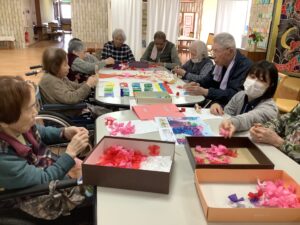 小さな花びらを皆で張り合わせて大きな紫陽花を作る予定です。