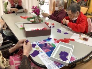 小さな花びらを皆で張り合わせて大きな紫陽花を作る予定です。