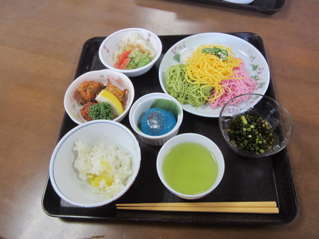 芋ご飯、すり身揚げ、三色の素麺に、クジラ湯引き、七夕ゼリーを提供しました🎵