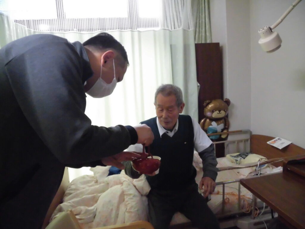 新年のご挨拶も兼ねてお屠蘇をのんでいただきたく施設長が各居室へ訪問しました😄