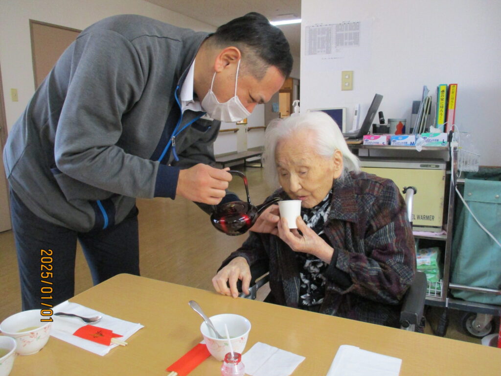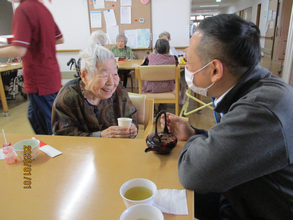 新年のご挨拶も兼ねてお屠蘇をのんでいただきたく施設長が各居室へ訪問しました😄