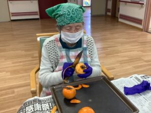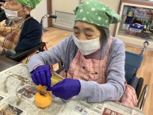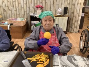 「昔しよったよ~」「庭になっとったもんね」とお話しながら、皆さん慣れた手つきでスルスルと剥いていきます🔪