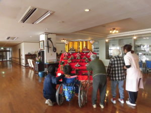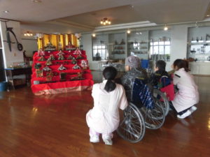 入居者の方々も1Fまで見に来られ「大きさ~」「こがん立派なお雛様見たとは久しぶりよ。」