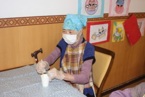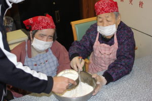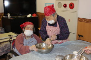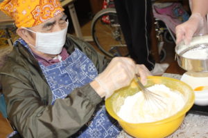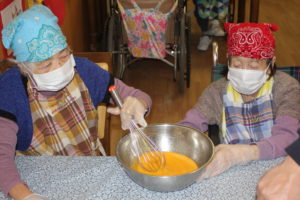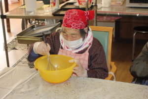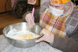 1人で混ぜるのは大変!! 皆さん協力しておやつ作りに取り組まれていました