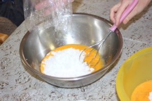 その間に、砂糖と卵を混ぜ合わせます