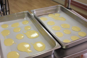 クッキングシートを引いた容器の上に丸く種を流し込んでいきます!(^^)!