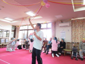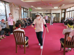 次の競技は、「キャッチボール」 職員が投げるボールをキャッチします。