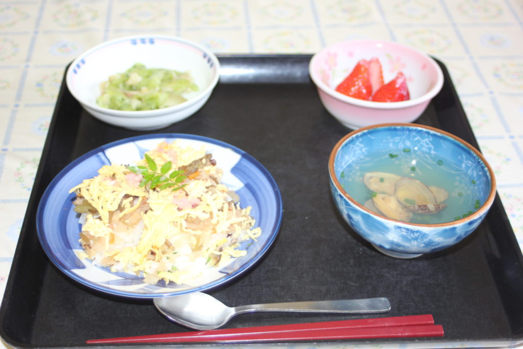 メニューは ふき寿司・あさりの潮汁・きゅうりと鯨のもみじゃ・いちご です