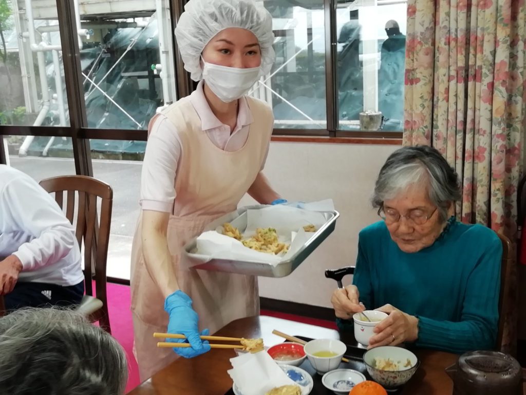 4/26(金)今日の昼食は、揚げたて天ぷらです😋初の試みで、目の前で揚げた熱々の天ぷらを食べていただきます🍤