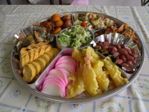 朝から皆さんに喜んでいただきたいと 調理職員総出で 手作りのオードブルとピースおにぎりを準備しました