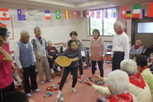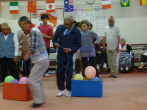 老人クラブの方々は 頭の上のザルにお手玉入れ(#^.^#)