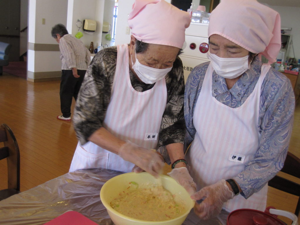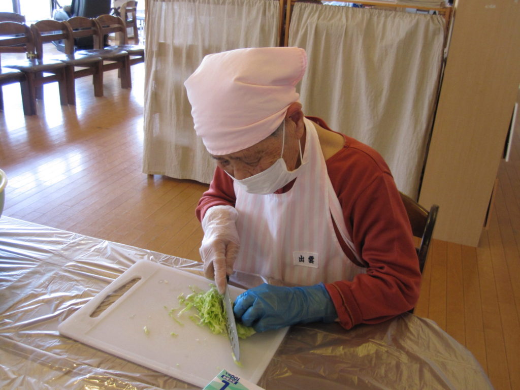 ご利用者の方が、キャベツを細かく切って下さり、混ぜます!!