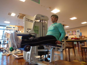 ゆっくり戻すことで、マシンの負荷が筋肉に刺激されることで膝痛の解消になります。逆に早く戻したり、勢いをつけて行うと効果は半分以下になります。